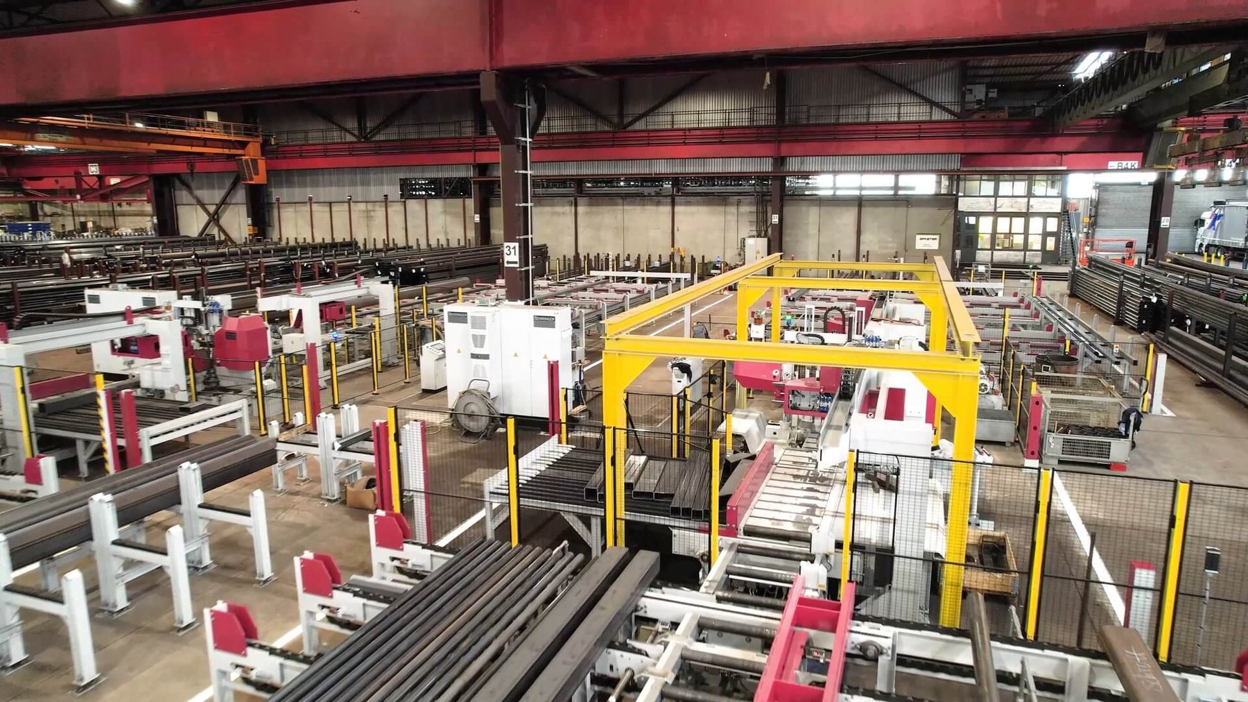 Les voies de transport internes à l'entreprise ont également pu être réduites grâce à une très bonne accessibilité aux lignes. L'ensemble du stock reste dans une nef et est déplacé vers la ligne de sciage à l'aide d'un pont roulant. Les pièces bonnes sont prélevées directement aux stations de dépôt en fonction de la commande et des colis sont créés pour le transport vers le client final.