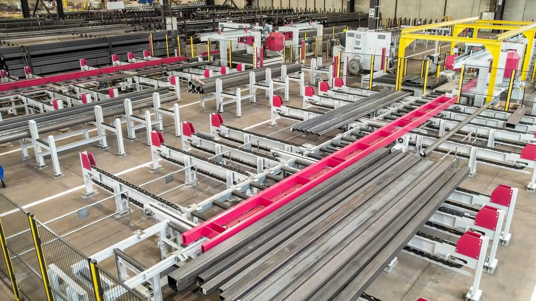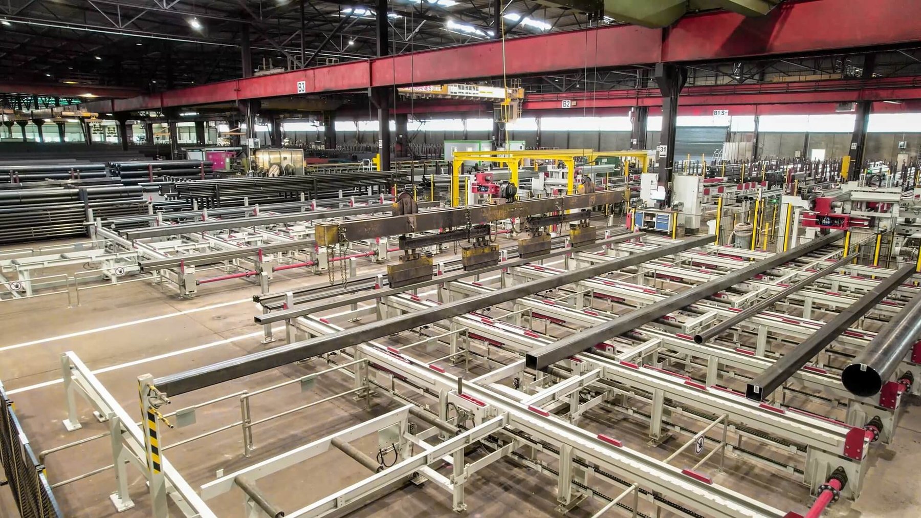 Le pont roulant permet de prélever simultanément des bottes ou plusieurs barres individuelles de l'entrepôt et de les déposer sur le stock préliminaire. L'opérateur a ici la possibilité d'enlever les cerclages et de séparer les bottes sans interrompre le fonctionnement automatique de la ligne de sciage. Ensuite, les différentes barres sont introduites sur les convoyeurs transversaux automatiques. La possibilité de séparer les matériaux de départ du côté de l'alimentation permet de réduire efficacement les courses et le temps d'utilisation des ponts roulants.
