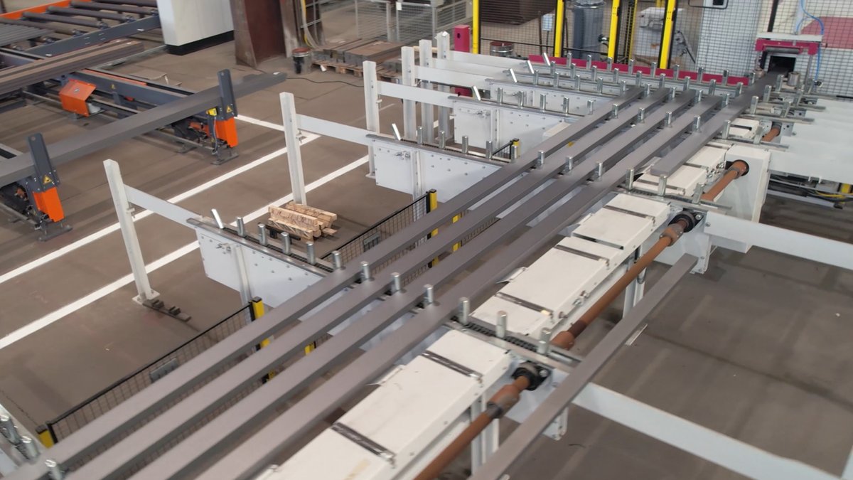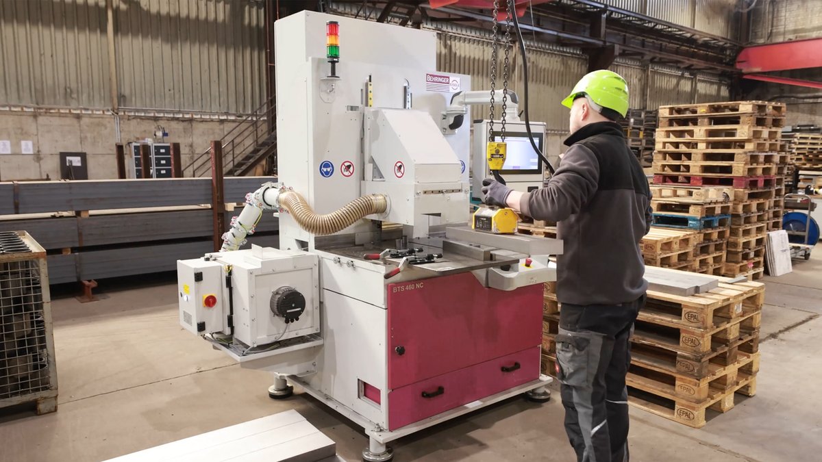 À l'aide d'une grue pivotante, les pièces peuvent être prélevées après le processus de poussage et déposées directement sur le dispositif de la BTS. Dans cette application particulière, un chanfrein est ensuite scié dans le matériau. Une opération qui, dans le passé, était confiée à l'extérieur et qui peut désormais être réalisée en interne avec des normes de qualité élevées .