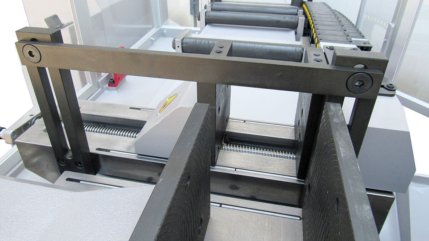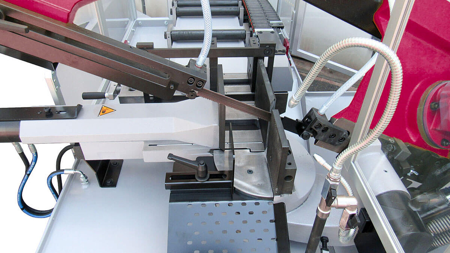 Une pince d'alimentation à déplacement hydraulique positionne le matériau pour les coupes en série. La longueur de coupe est réglée par une butée qui est positionnée par une broche entraînée. La longueur de coupe et le nombre de coupes à effectuer peuvent être présélectionnés dans la commande. Le cycle automatique se termine lorsque le nombre de pièces souhaité est atteint ou à la fin du matériau.